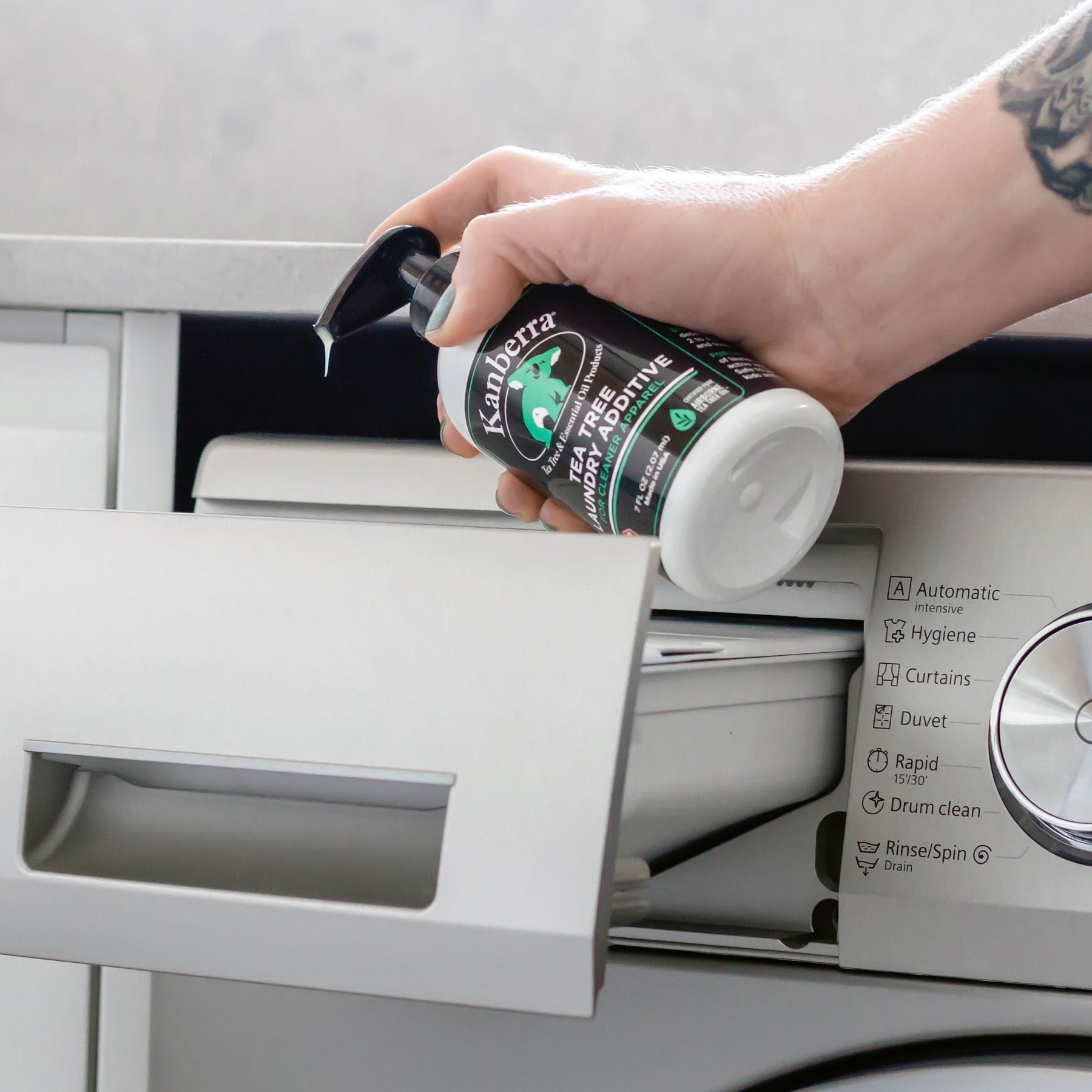 Kanberra Tea Tree Laundry Additive neutralizes stubborn odors like sweat, mildew, and smoke — leaving laundry simply clean, not perfumed.